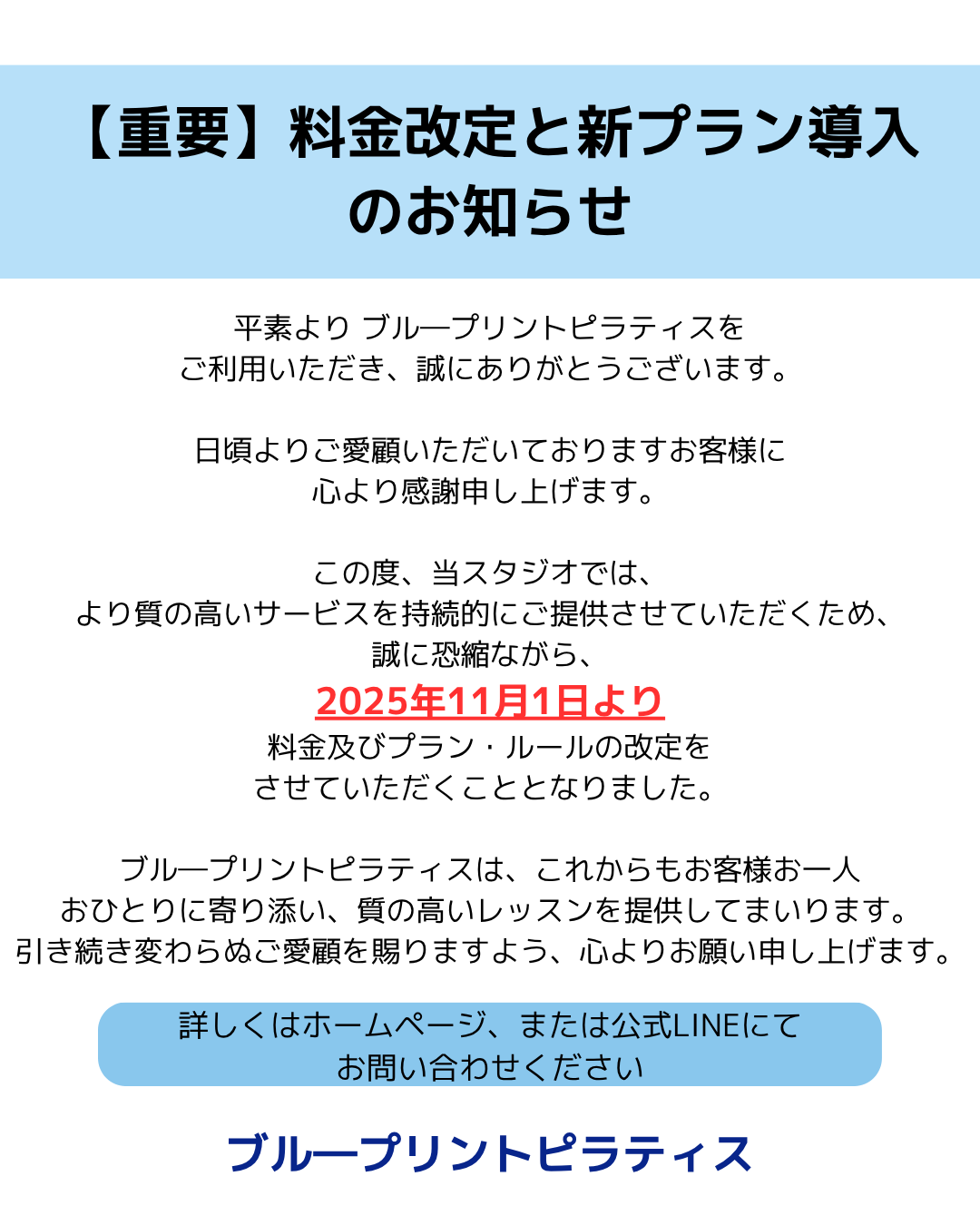 平素よりブル―プリントピラティスをご利用いただき、誠にありがとうございます。日頃よりご愛顧いただいておりますお客様に…